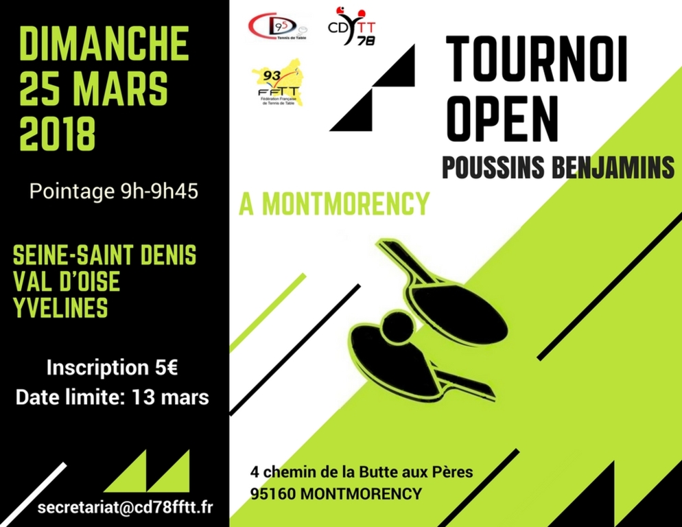 Le Tournoi Open Interdépartemental ( Seine-Saint Denis, Val d'Oise, Yvelines) se tiendra à Montmorency le 25 Mars 2018.